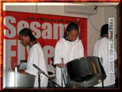 The night continued with tenor soloists Uri Narinesingh; Nicholas Mohan and Ricardo Greenaway performing consecutively, with the backing of a combination of 'Mellow Tone Steel' featuring Wayne Curtin on keyboards and Jason "Peanut" Isaacs on bass guitar. Nicholas Mohan performed songs from his current CD, such as I Shot the Sheriff, along with a couple of duets with Nyasha Rhoden on flute. Ricardo Greenaway also performed a series of song from his last CD. His versions of Santana's Oye Como Va and Bob Marley's Jammin' caught the attention of the audience. His personal shifting of the micing from the belly of the instrument clearly moved Greenaway out of the ranks of amateur performers, and showed a concern and knowledge of sound and musician's responsibility - as to how he was presented sonically to the audience. note: Given the critical nature of micing in these small settings, it is amazing that all live steelpan performers do not own a set of personal microphones that is specifically flattering to their instrument(s). On the topic of sound, Sesame Flyers is one of the few steelband organizations (the other being Utopia Pan Soul: the Next Generation) that has made a serious investment in both sound reinforcement technology, equipment and knowledge to present the best sonic situation to their audience. They are not perfect but they keep getting better and the commitment to excellence is definitely there. And the large screen video/DVD projector added a nice touch to the overall presentation, as the audience was privy to the Sesame Flyers DVD.