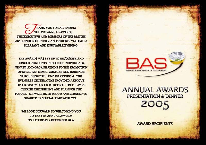 United Kingdom - The British Association of Steelbands 7th Annual Awards was hosted at the Holiday Inn, Bloomsbury on the 3rd December 2005. This event was established in 1999 to recognise and celebrate the contributions of individuals and groups within the steelpan community. Since its inception, the event has grown in stature and has established itself in the UK Community’s calendar.