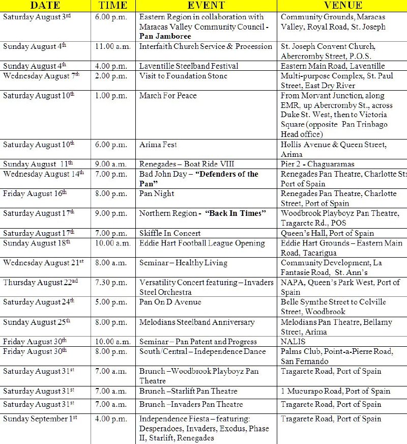 It was on August 30, 1992 that the steelpan was declared the National Musical Instrument of Trinidad & Tobago and in keeping with this edict, Pan Trinbago recognizes the occasion annually with a number of events with the steelpan as the main focus. This year’s activities run from August 3 to September 1 throughout the country. These include a March for Peace, Pan Jamborees, Seminars, Steelband Concerts and Independence Day Brunches organized by the various Regions of the Pan Trinbago steelband body, communities and individual steel orchestras. See schedule of events.